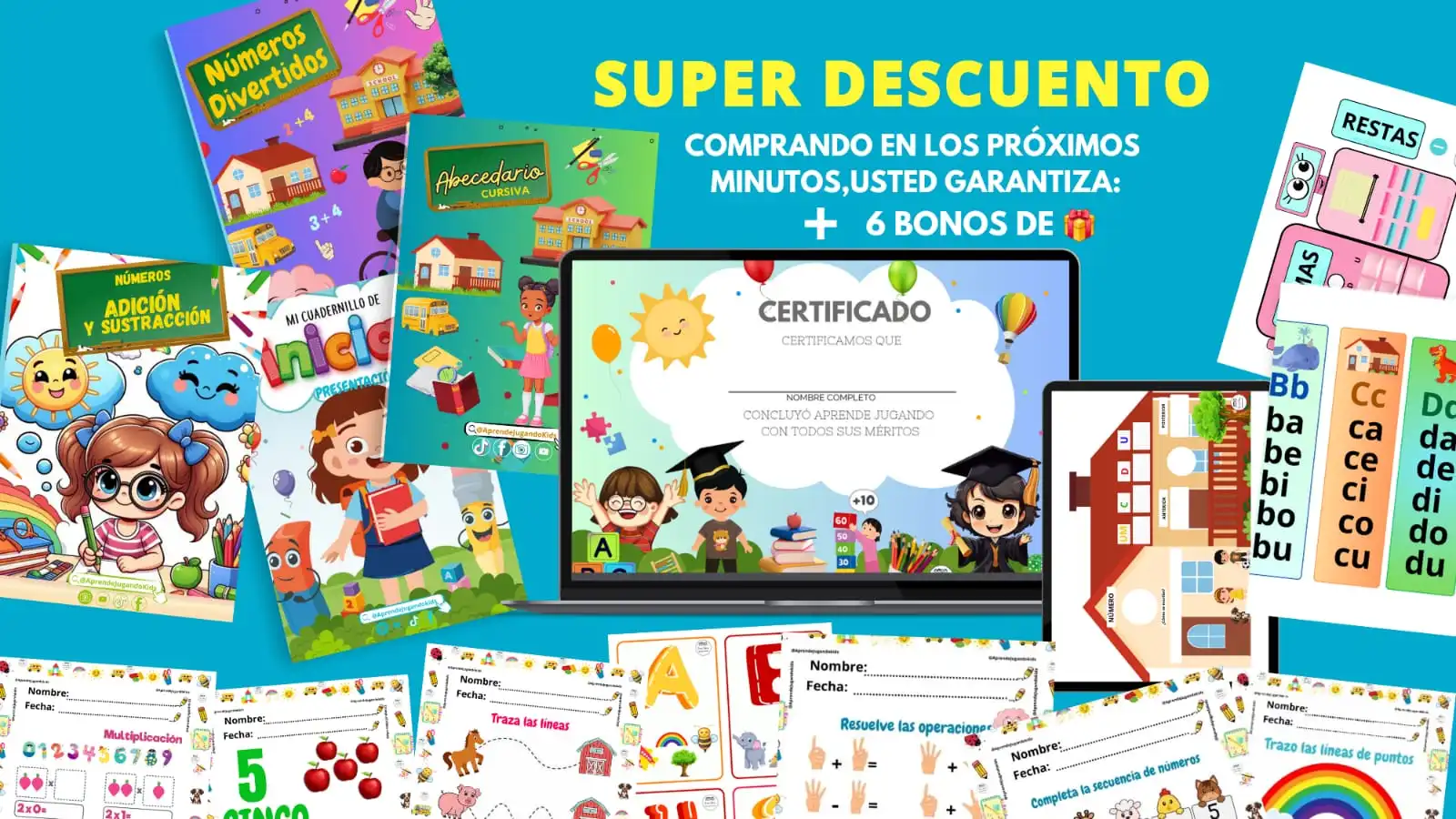 Recortar y Pegar, Calculadora Suma y restas , Casita para descomponer números(Escribe su nombre, anterior y posterior, descomposición: unidad de mil,decena,centena,unidad), Silabario, 142 Cartas de estimulación de lenguaje(Vocales,Colores,Números,Profesiones,Animales,Vestimenta,Frutas y verduras, Nociones, Partes del cuerpo). Pero no solo eso, al completar las actividades, tu pequeño también recibirá un Certificado Infantil Personalizado con su nombre.