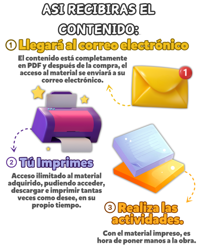 De forma RÁPIDA y FÁCIL, después de la aprobación de la compra, el acceso al contenido se enviará automáticamente a su correo electrónico. A continuación, podrá imprimirlo en su tiempo y realizarlo con su pequeño