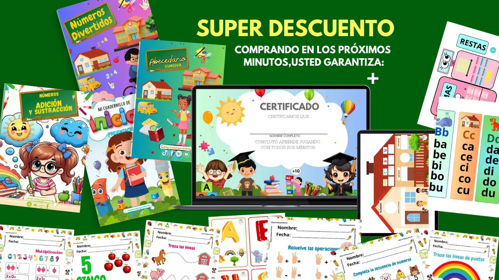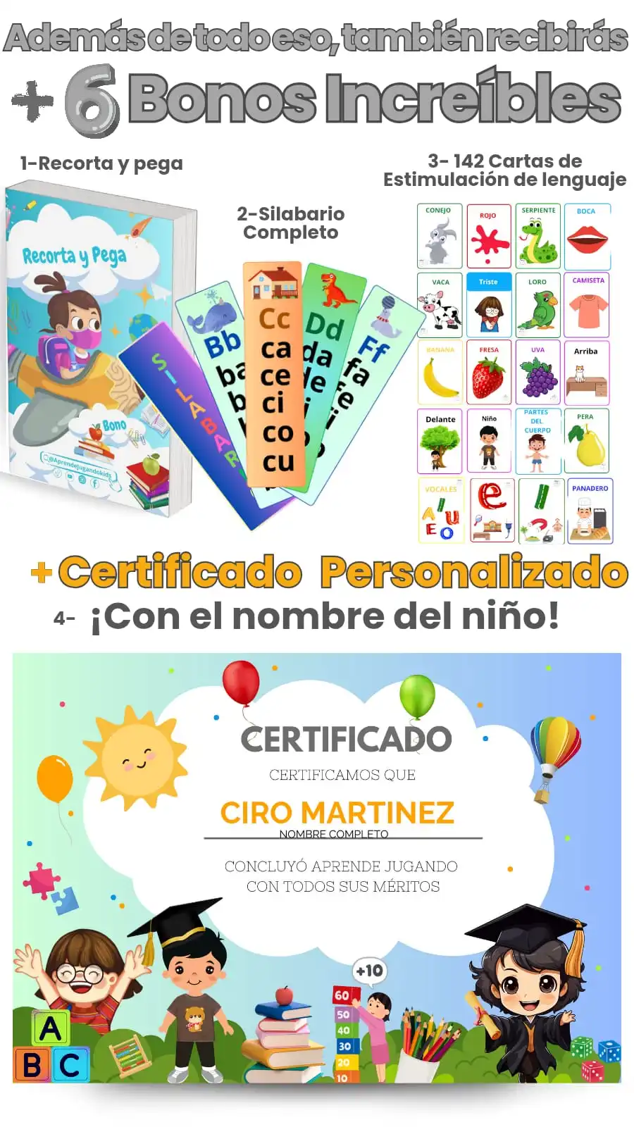 Recortar y Pegar, Calculadora Suma y restas , Casita para descomponer números(Escribe su nombre, anterior y posterior, descomposición: unidad de mil,decena,centena,unidad), Silabario, 142 Cartas de estimulación de lenguaje(Vocales,Colores,Números,Profesiones,Animales,Vestimenta,Frutas y verduras, Nociones, Partes del cuerpo). Pero no solo eso, al completar las actividades, tu pequeño también recibirá un Certificado Infantil Personalizado con su nombre.